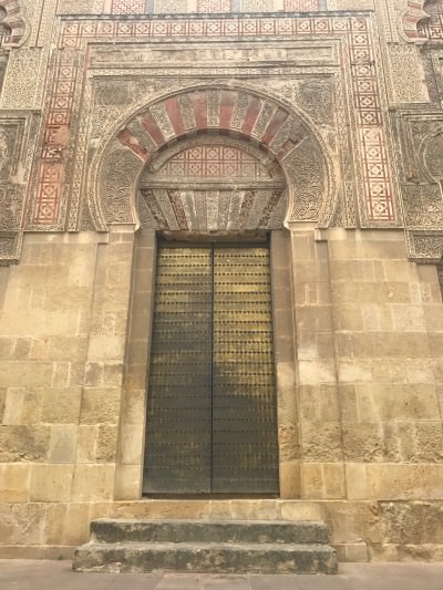 So, to La Mezquita, which quite rightly has its own UNESCO listing. First we walked around it (no mean feat in the heat) and admired the incredible doors. Golden doors, heavy doors, studded doors with the classic rust/cream striped horseshoe shaped Moorish arches by which the Mezquita is known. Then we went in, to the Patio de los Naranjos, a beautiful cobbled patio with super neat cypress and tropical looking date palms. More so than the Alhambra, it felt overwhelmingly Arabic. Beautiful little channels to irrigate the plants, ornately carved wooden screens and that ever-present stripe of rust and cream.